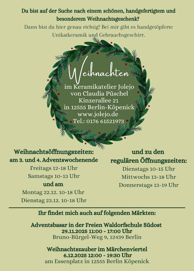 ACHTUNG: Das Atelier bleibt während der Betriebsferien geschlossen.